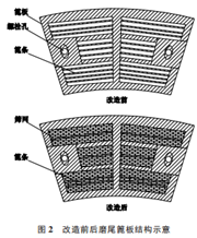上述解決出料篦板堵塞的措施只能起到緩解出料篦板的堵塞、延長出料篦板的清理周期的作用,不能從根本上徹底解決問題。因此,還需對球磨機(jī)出料篦板的結(jié)構(gòu)進(jìn)行改造。通過利用現(xiàn)有材料自制防堵塞篦板,降低堵塞影響,增大磨尾通風(fēng)面積,解決飽磨問題。改造前后磨尾篦板結(jié)構(gòu)示意見圖2。