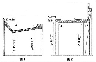以Φ4000×1400濕式自磨機為例。濕式自磨機進料部由進料襯套和中空軸組成,它們的結構分別如圖1和圖2所示,該結構有兩個配合面,為Φ1380面和Φ1420面,進料襯套上的兩個配合面公差均為-0.410~-0.190,中空軸上的兩個配合面公差為0~+0.220,兩個相對應的配合面之間所形成的配合間隙大為0.63,小為0.19,中空軸前端有12個周布的、深度為40的M24內螺紋孔,與進料襯套上的12個Φ28孔相對應,中空軸和進料襯套之間就用這12根M24 的螺桿進行聯接,進料襯套以這l2根螺桿進行軸向固定,依靠兩個配合臺面進行徑向固定,進料襯套的運動則通過這l2根螺桿來傳遞。